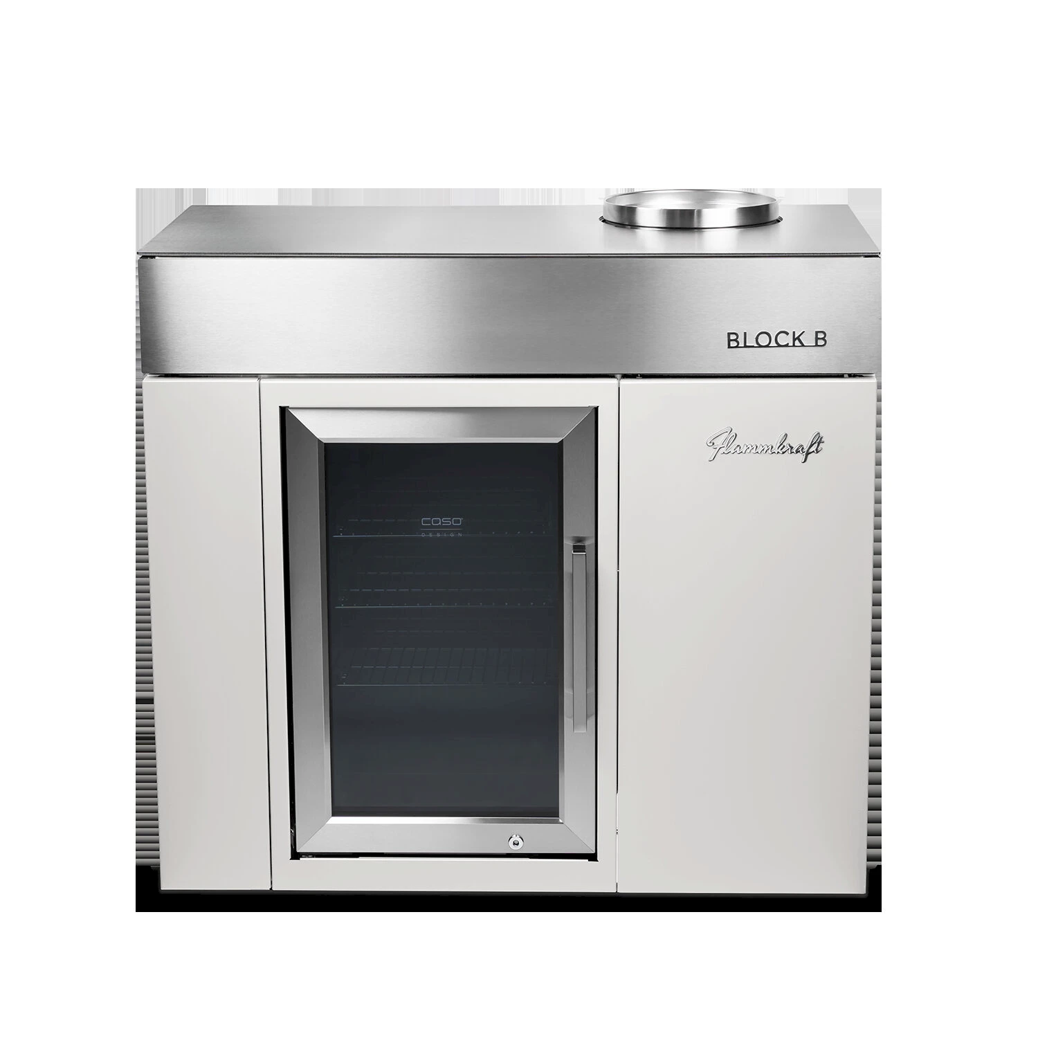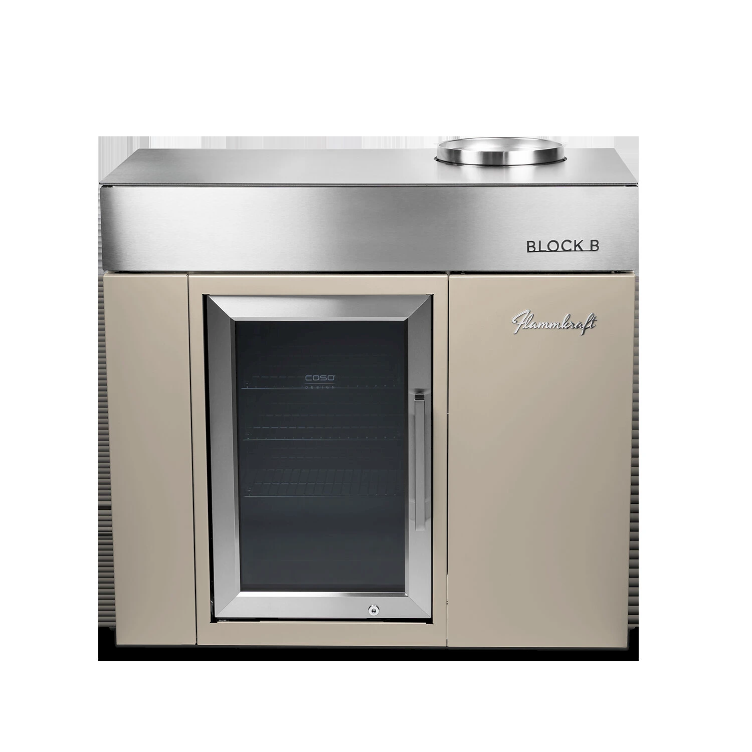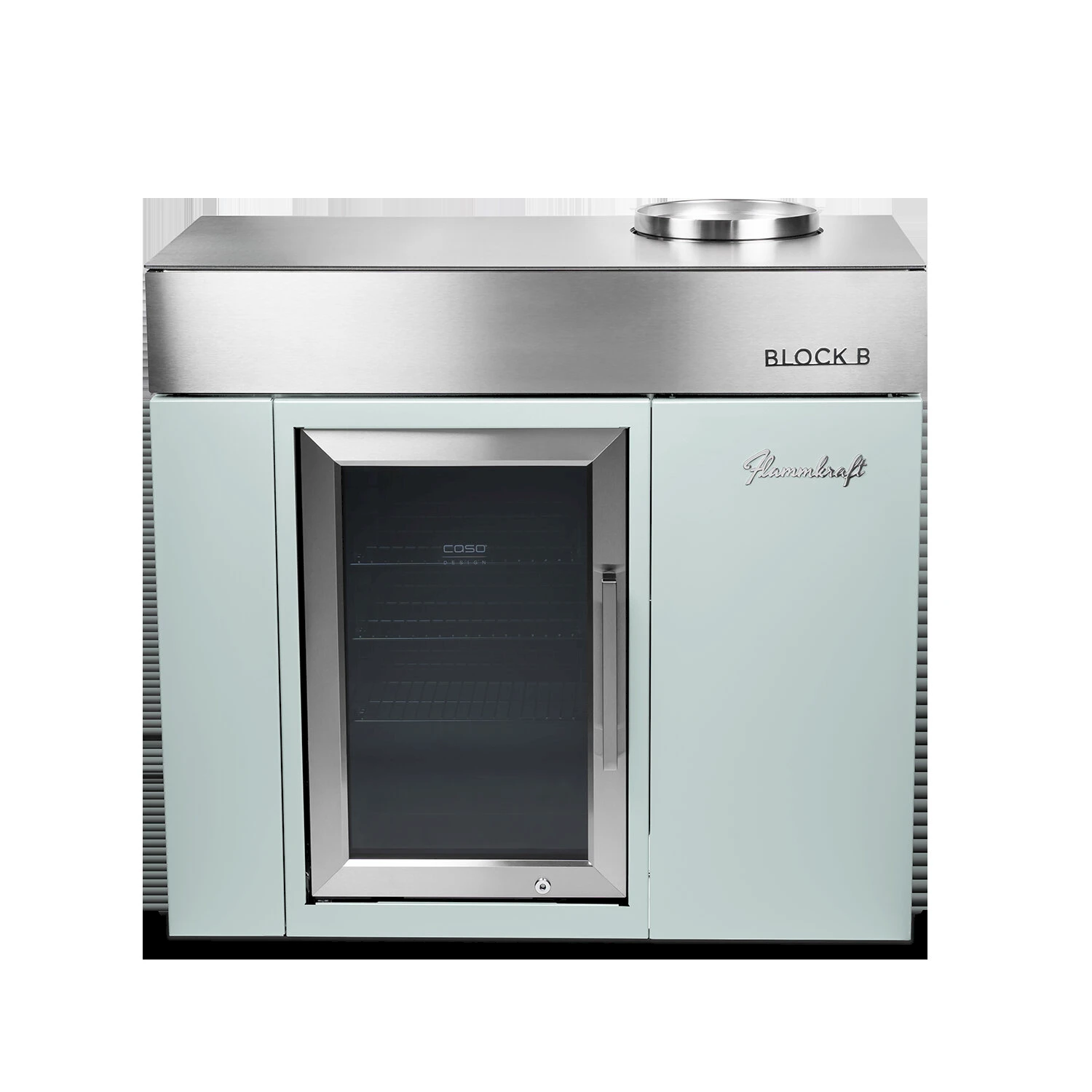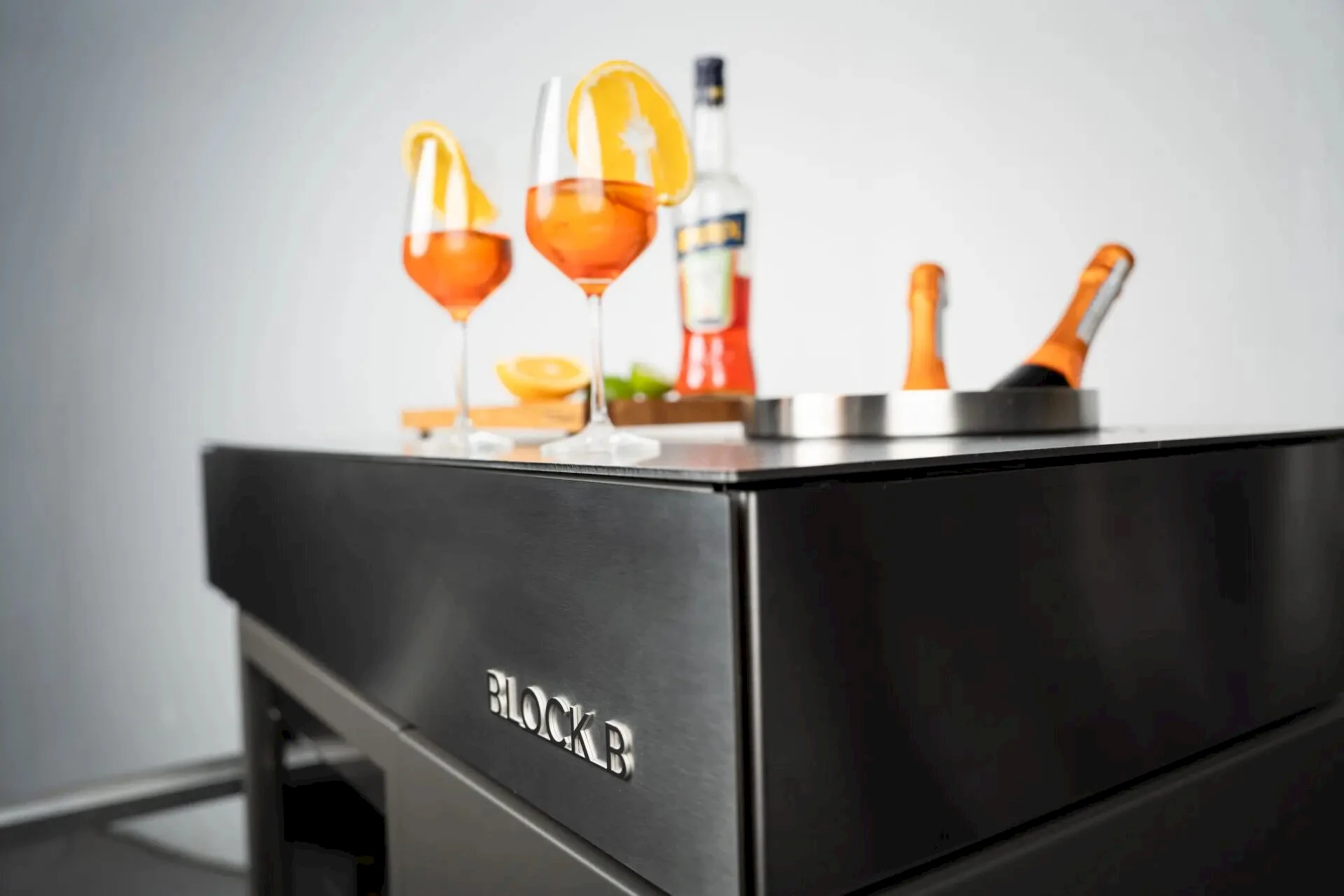 - Block B rozširuje systém Flammkraft o premyslene navrhnuté barové riešenie: v základni je integrovaná 63-litrová vonkajšia chladnička, ktorú dopĺňa dvojstenný, vákuovo izolované nerezové vedro na ľad. Vedro možno umiestniť do vyhradeného otvoru v pracovnej doske.
