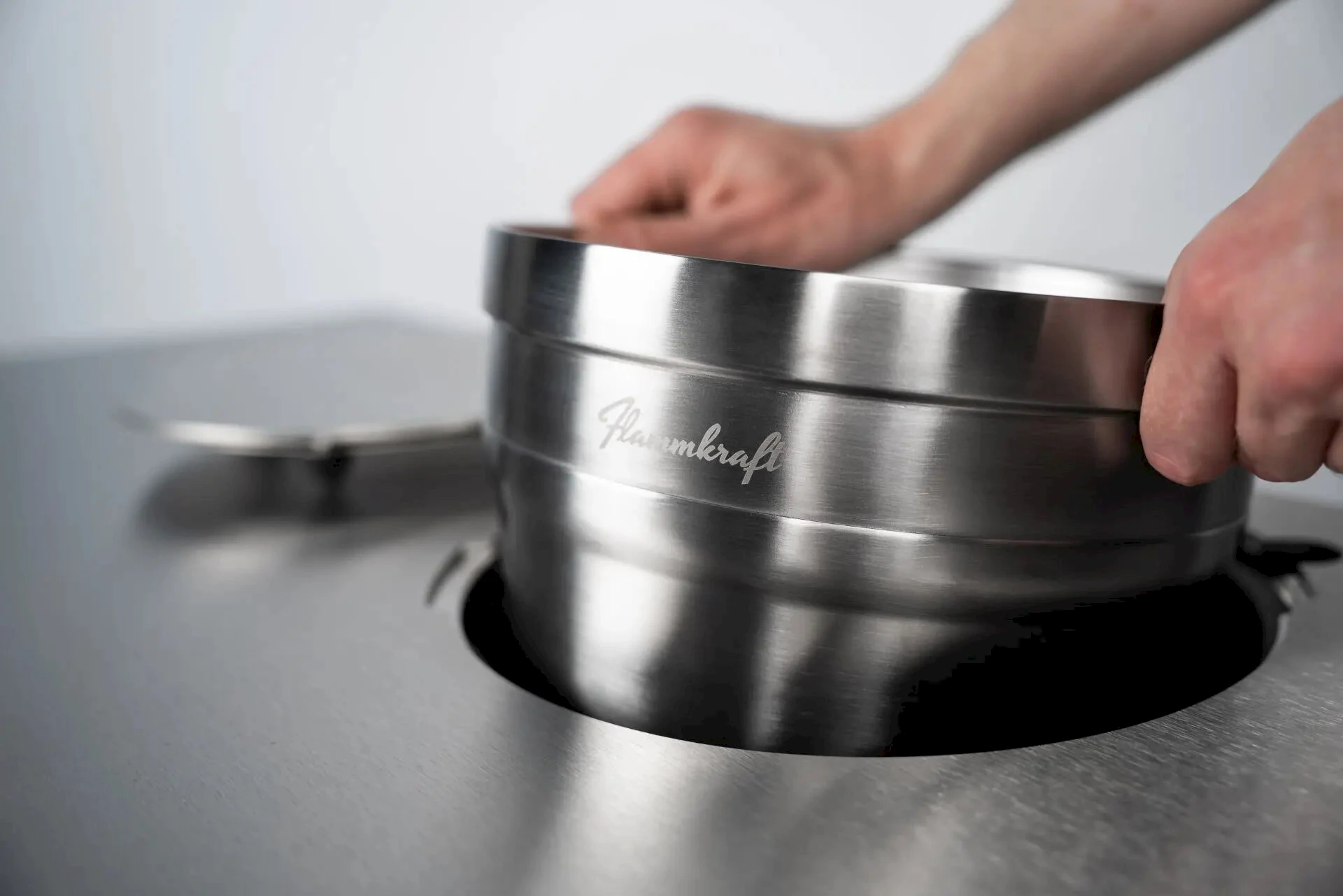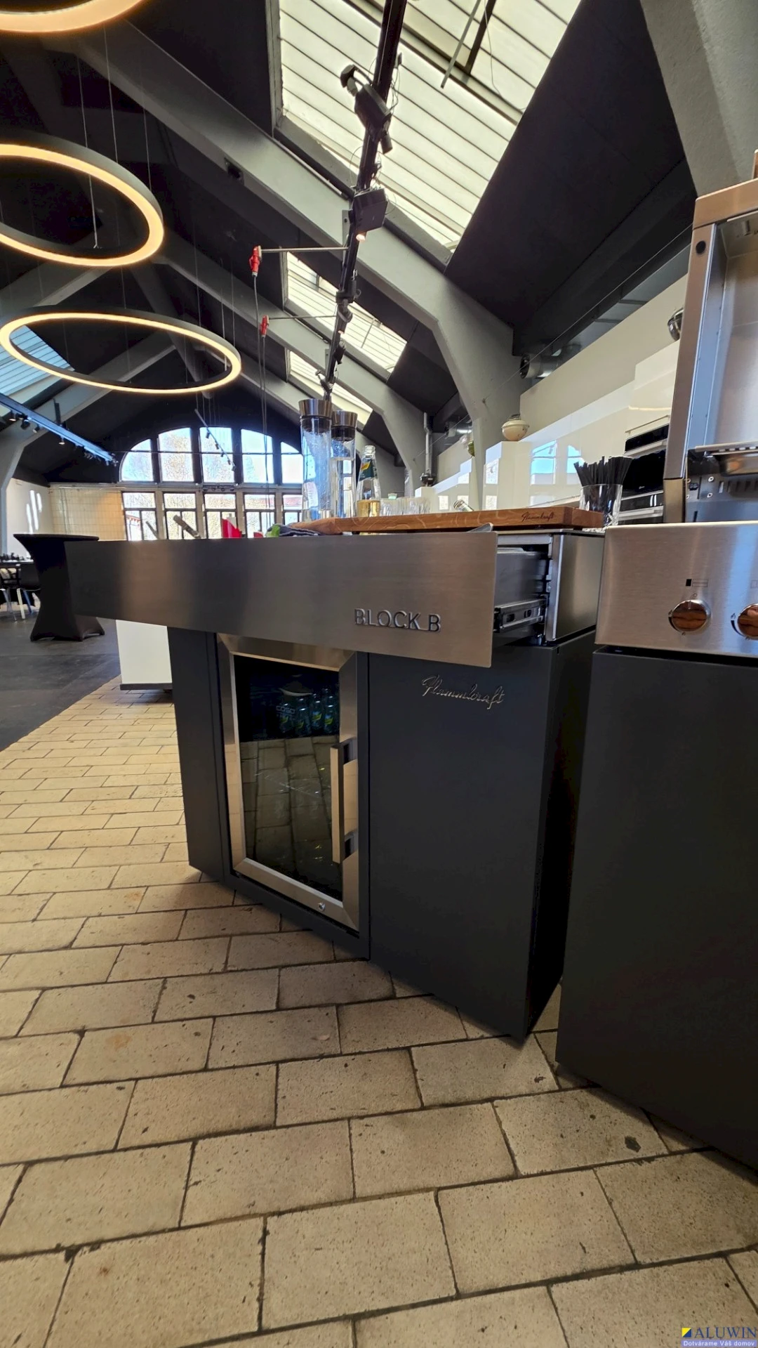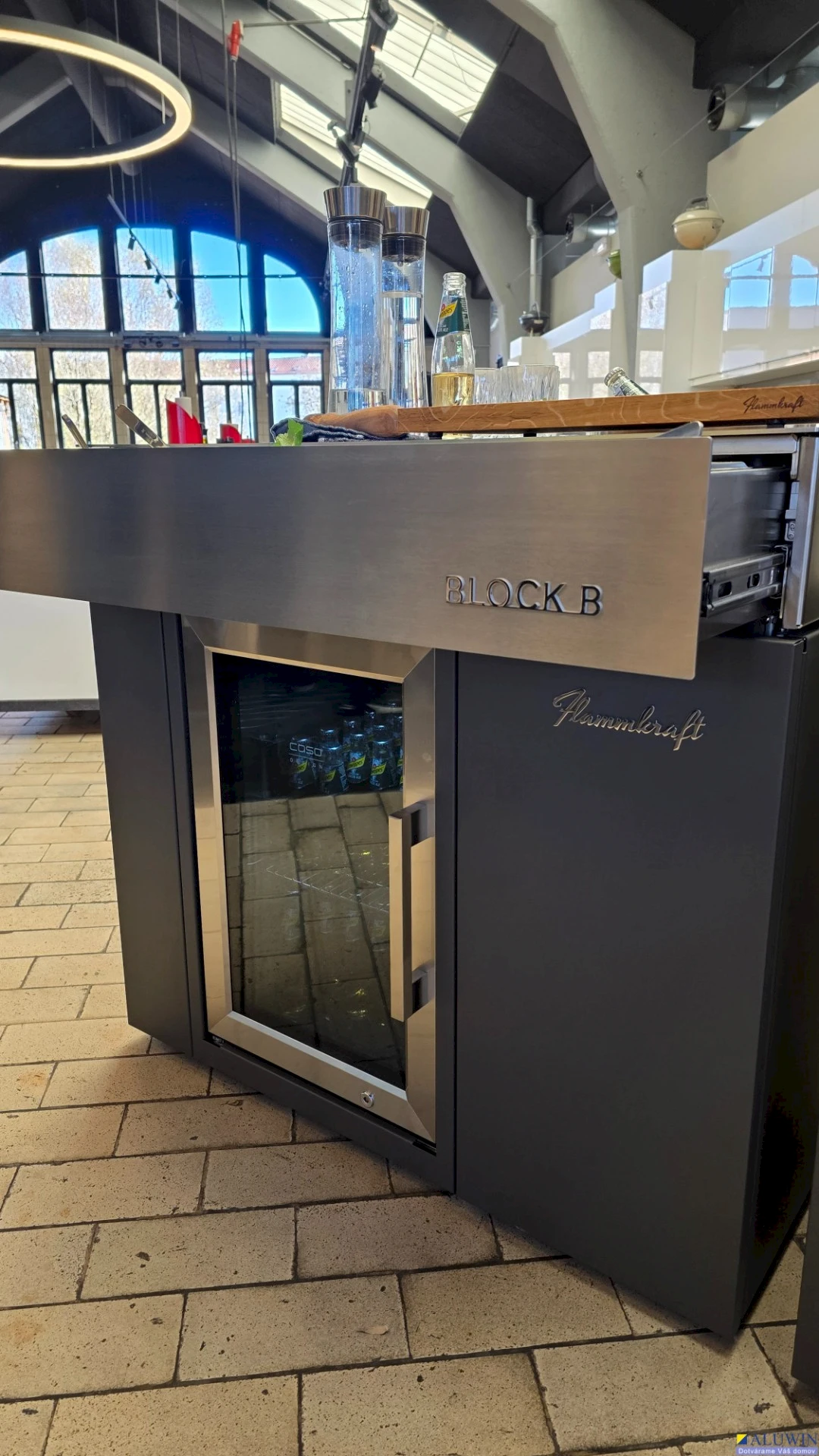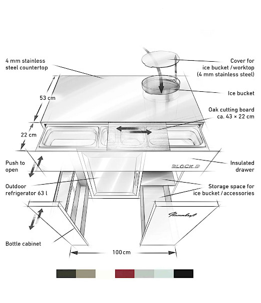 - Block B rozširuje systém Flammkraft o premyslene navrhnuté barové riešenie: v základni je integrovaná 63-litrová vonkajšia chladnička, ktorú dopĺňa dvojstenný, vákuovo izolované nerezové vedro na ľad. Vedro možno umiestniť do vyhradeného otvoru v pracovnej doske.