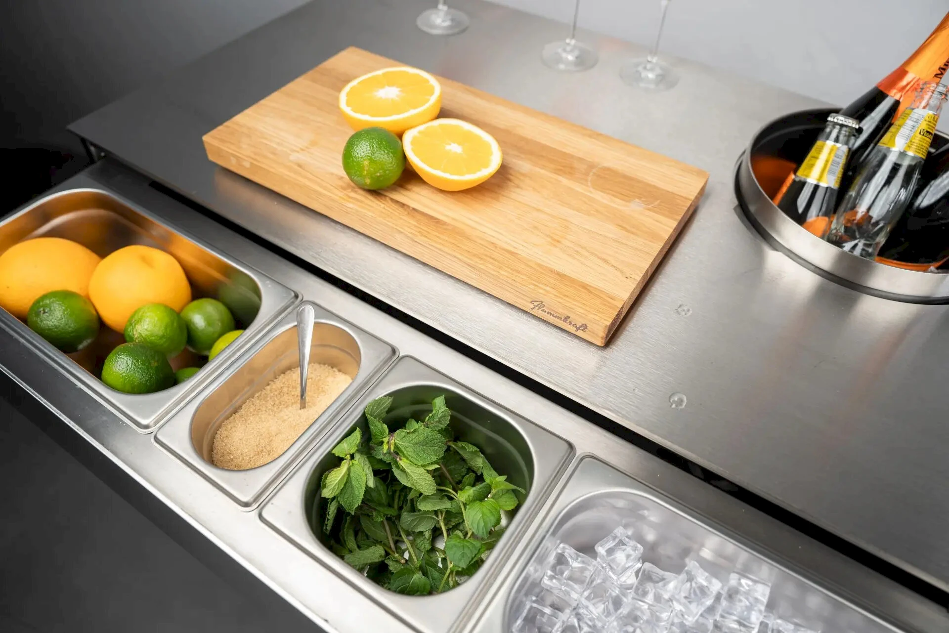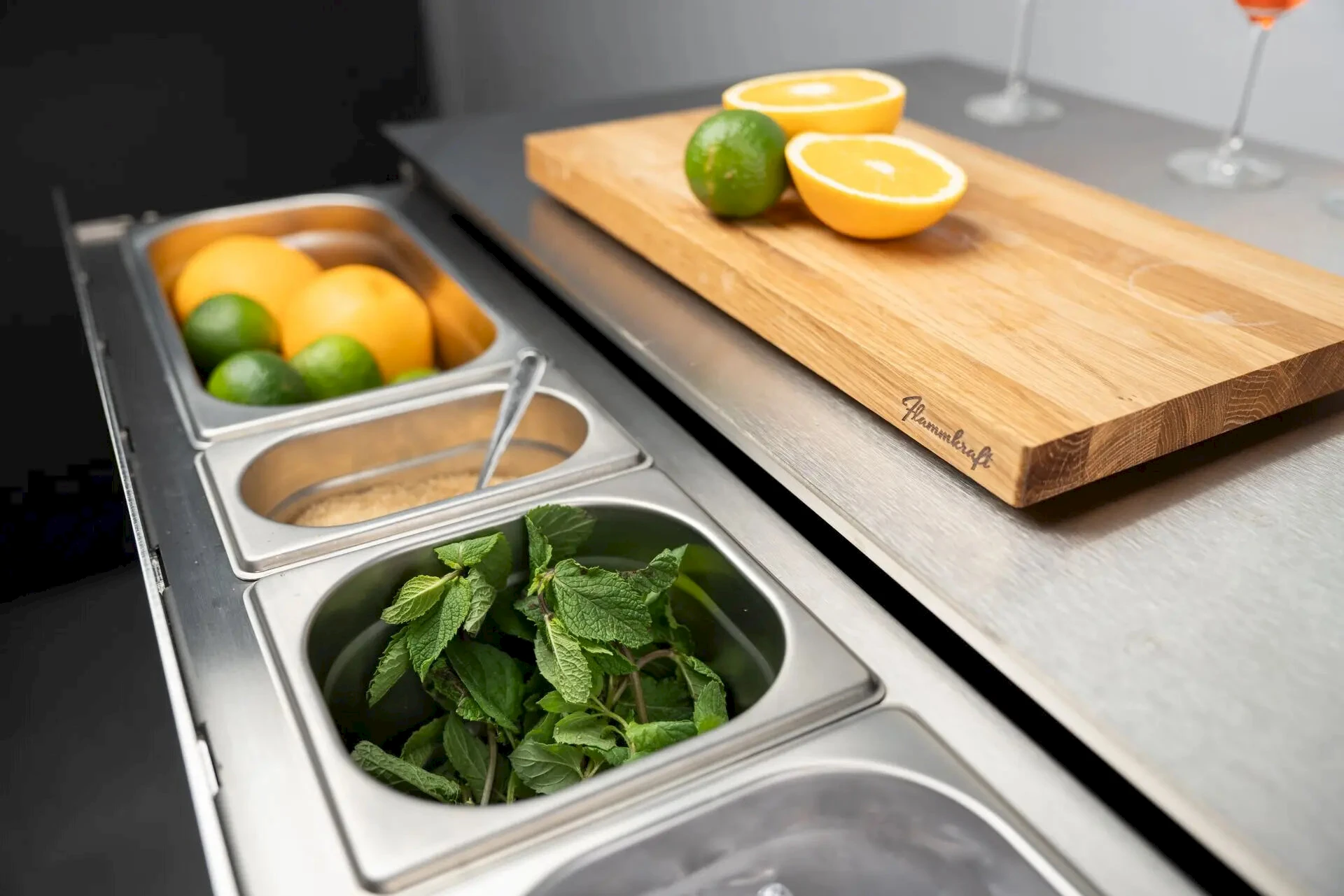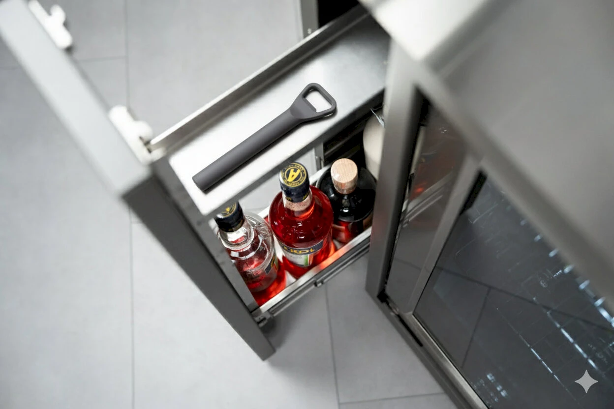 - Izolovaná horná zásuvka udržiava kocky ľadu, prísady, bylinky a ďalšie doplnky čerstvé a vždy po ruke v štyroch nerezových nádobách. Fľaše, príslušenstvo a iné pomôcky možno uložiť v základni. Voliteľné bočné police ďalej rozširujú využiteľnú plochu.