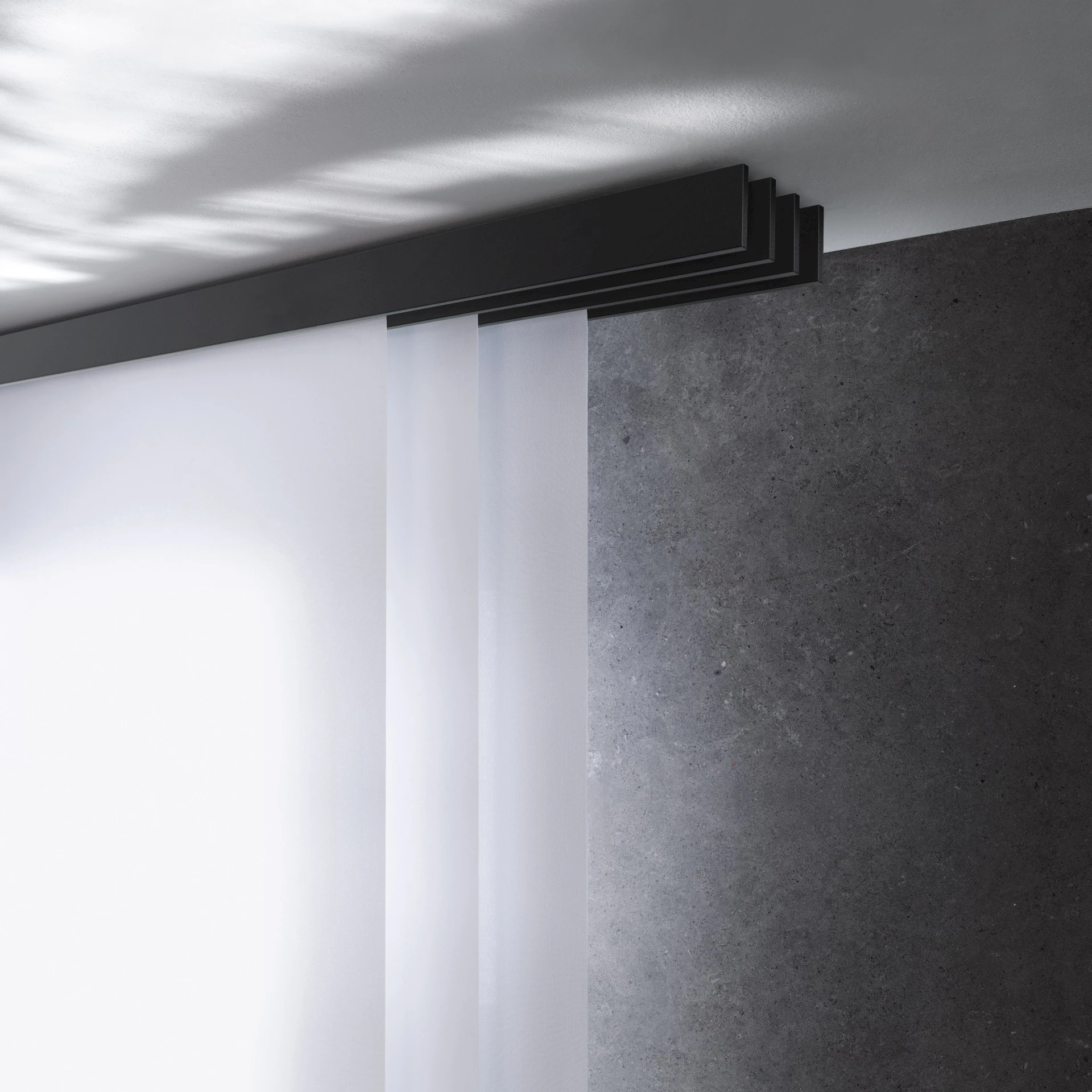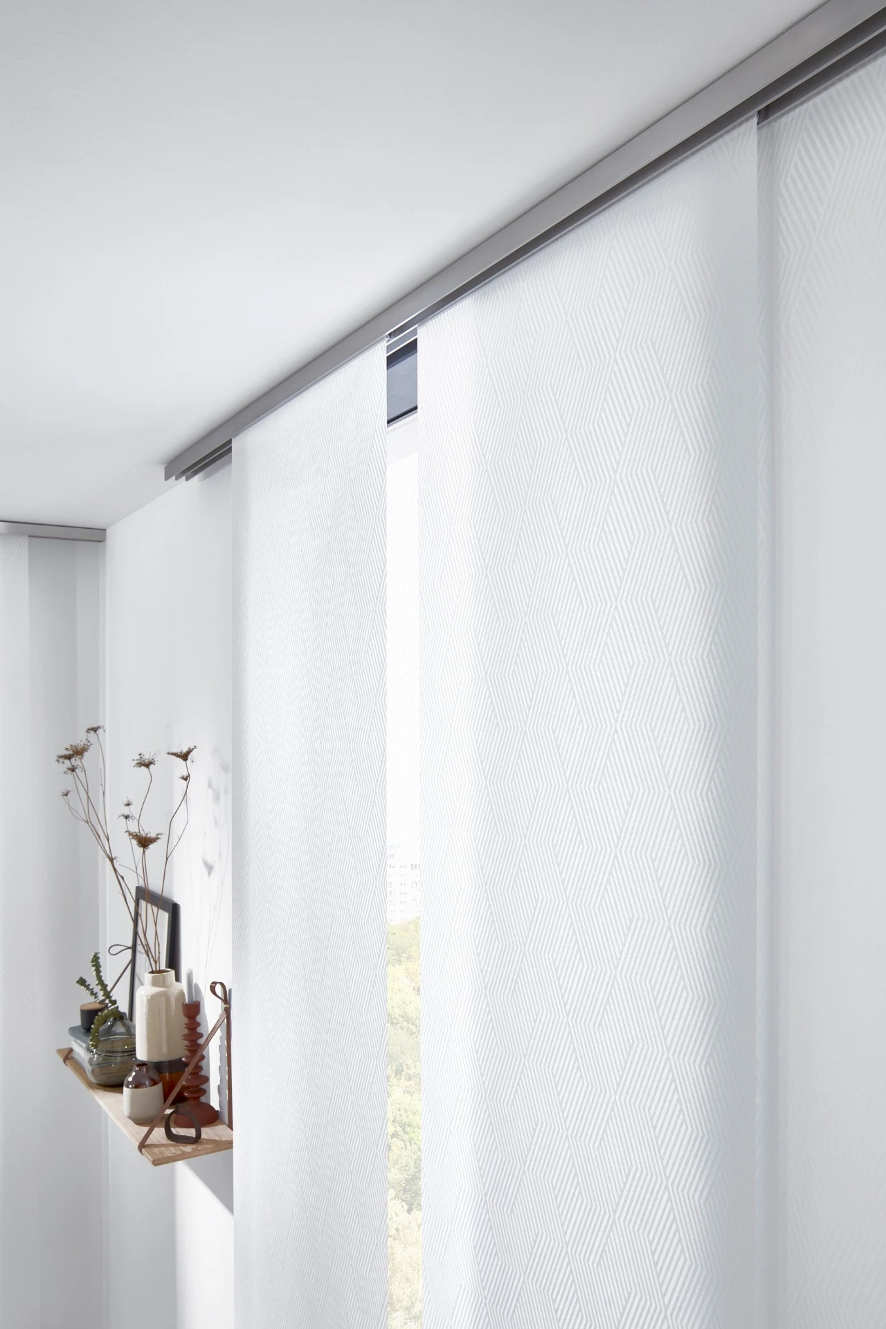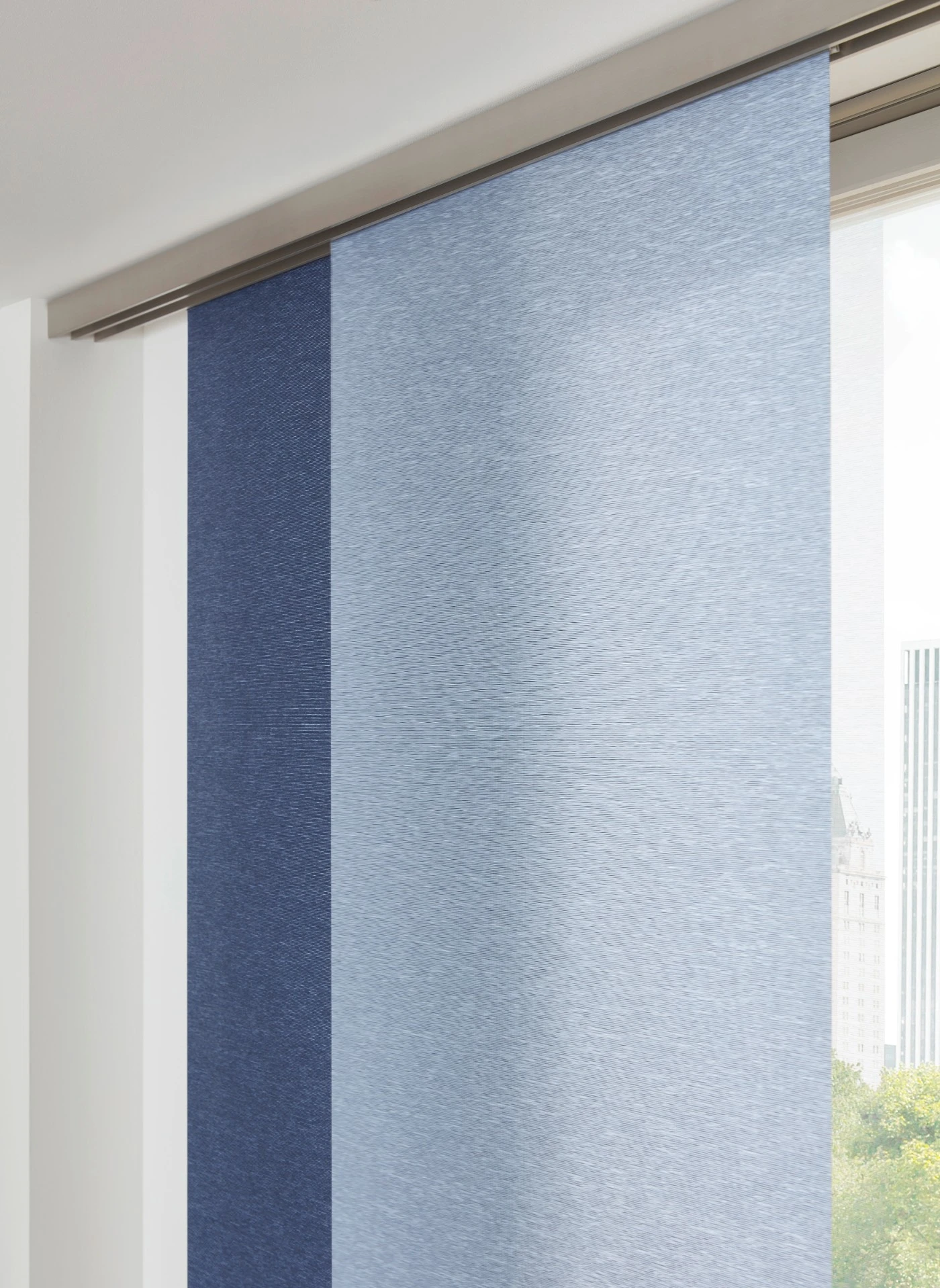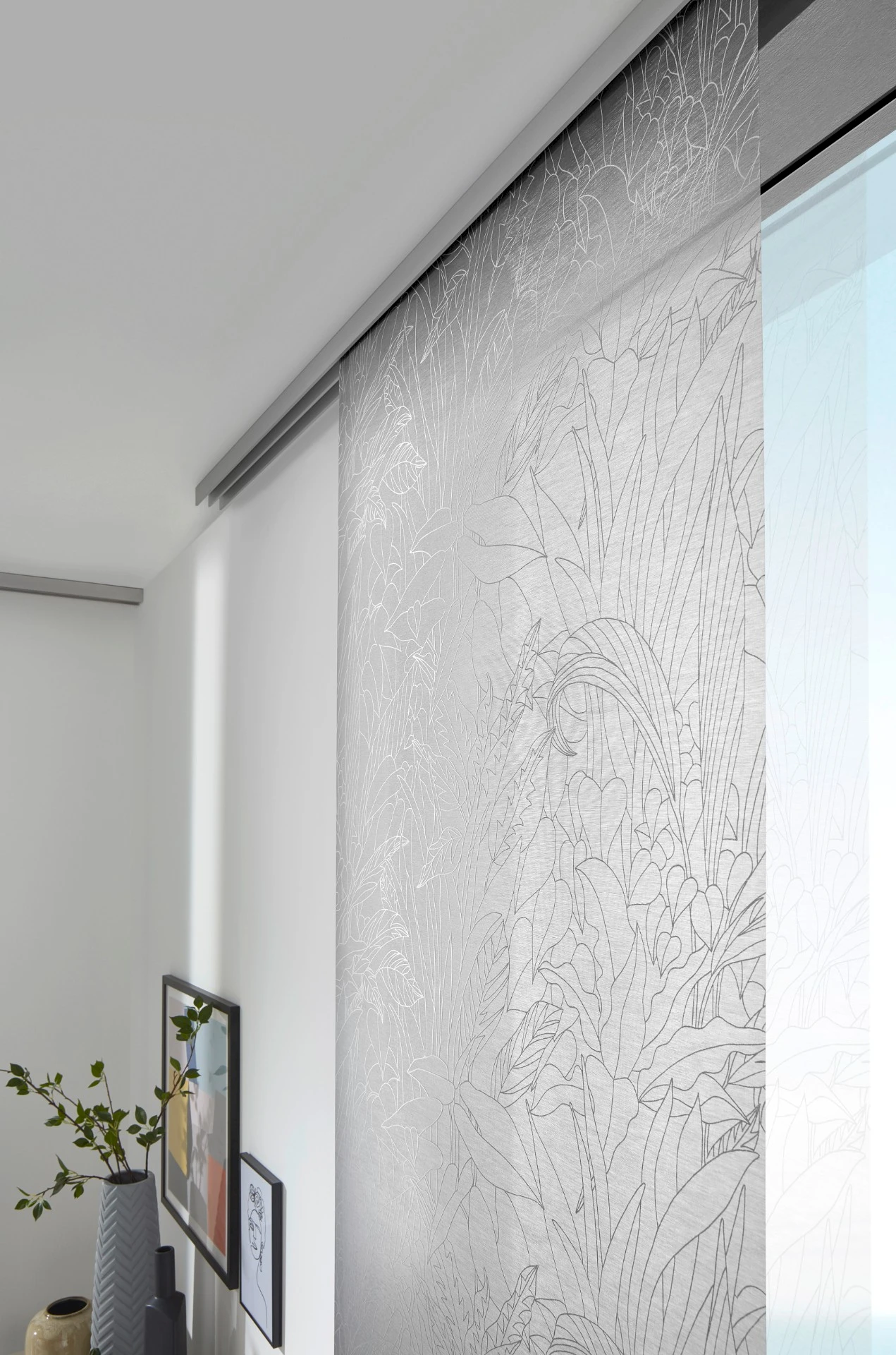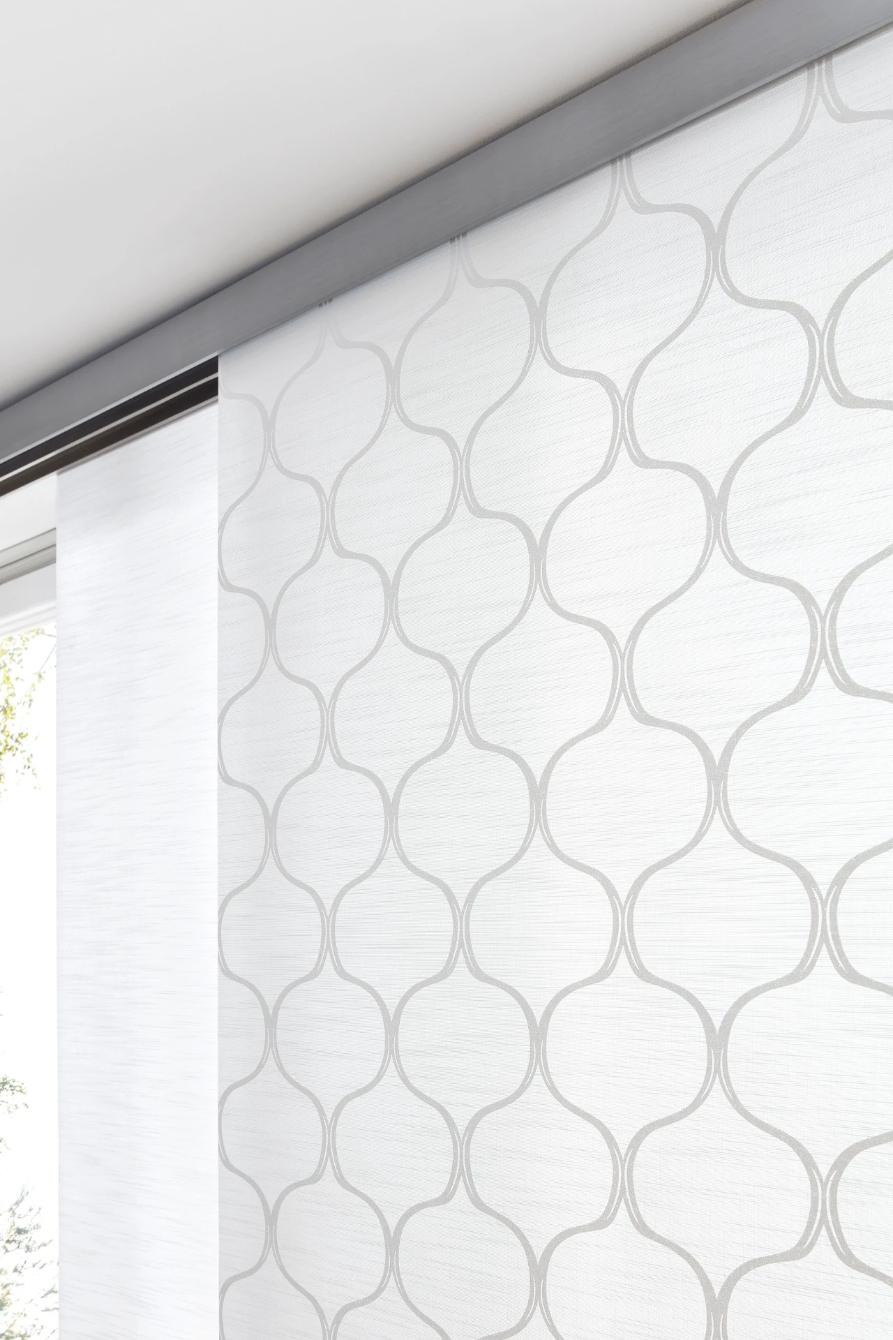 - Panelová stena sa skladá z niekoľkých vertikálnych textilných panelov, ktoré sa pohybujú v koľajnicovom systéme.