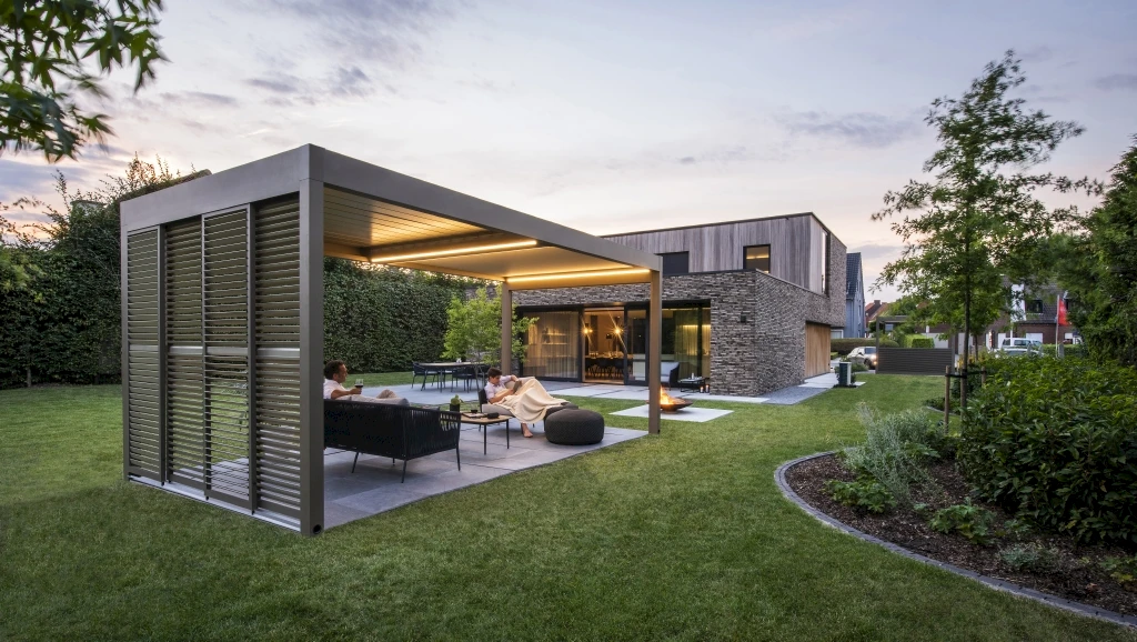 Algarve Canvas je pergola s pevnou strechou s napnutým podhľadom z estetickej tkaniny s využitím technológie Fixscreen.