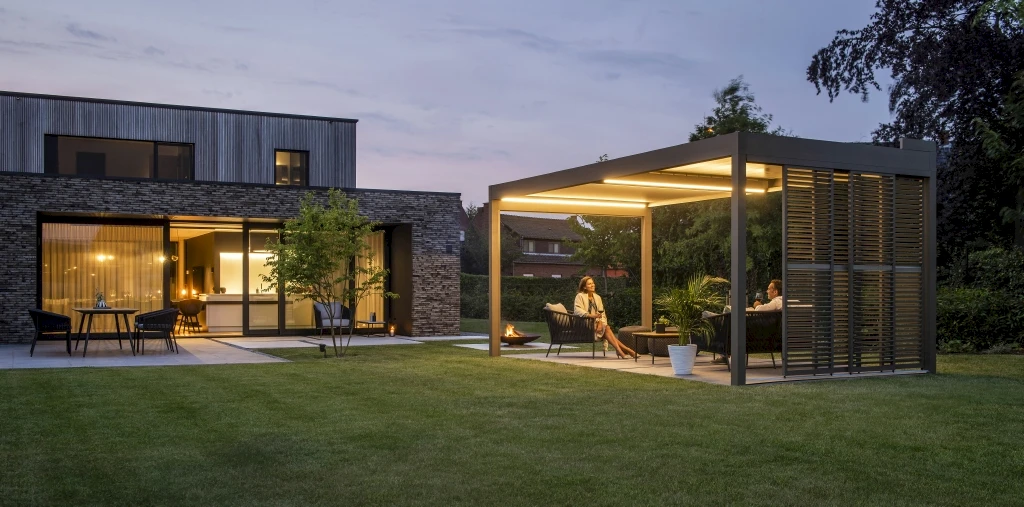 LED osvetlenie je plne integrované do otočných strešných lamiel. Káble sú skryté a na manipuláciu využívate diaľkové ovládanie.