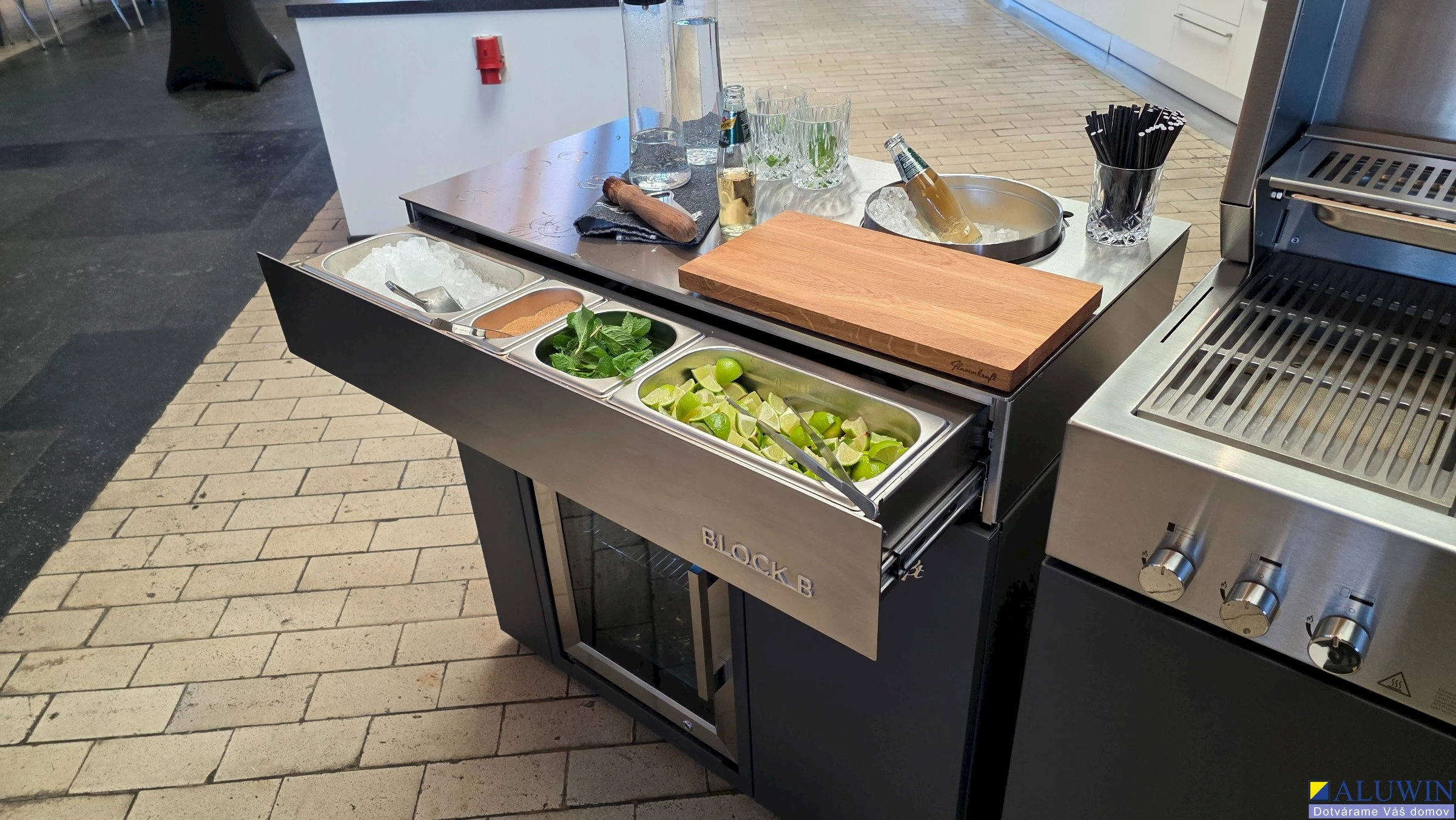 - Block B rozširuje systém Flammkraft o premyslene navrhnuté barové riešenie: v základni je integrovaná 63-litrová vonkajšia chladnička, ktorú dopĺňa dvojstenný, vákuovo izolované nerezové vedro na ľad. Vedro možno umiestniť do vyhradeného otvoru v pracovnej doske.