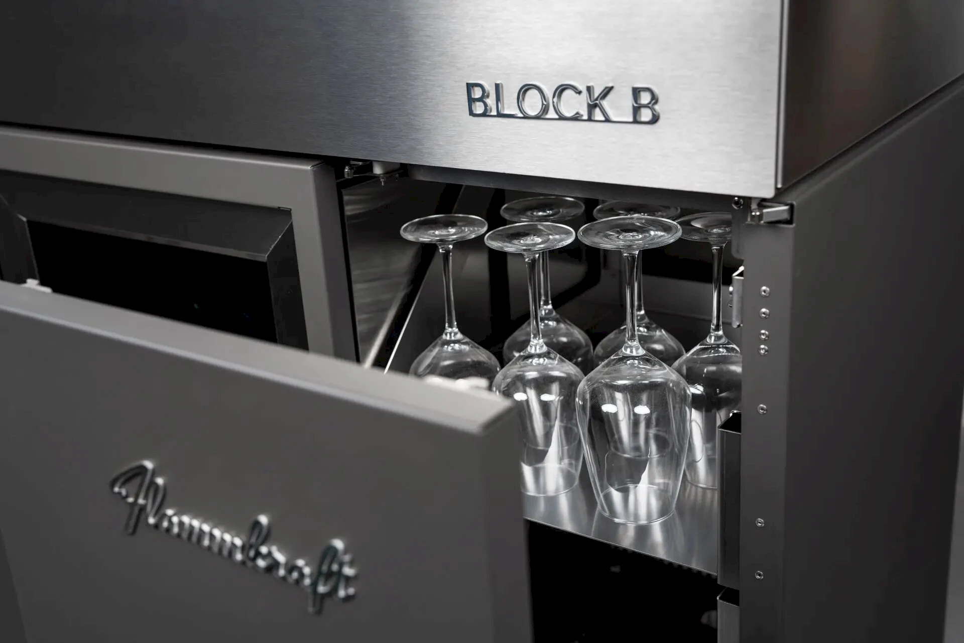 - Block B rozširuje systém Flammkraft o premyslene navrhnuté barové riešenie: v základni je integrovaná 63-litrová vonkajšia chladnička, ktorú dopĺňa dvojstenný, vákuovo izolované nerezové vedro na ľad. Vedro možno umiestniť do vyhradeného otvoru v pracovnej doske.